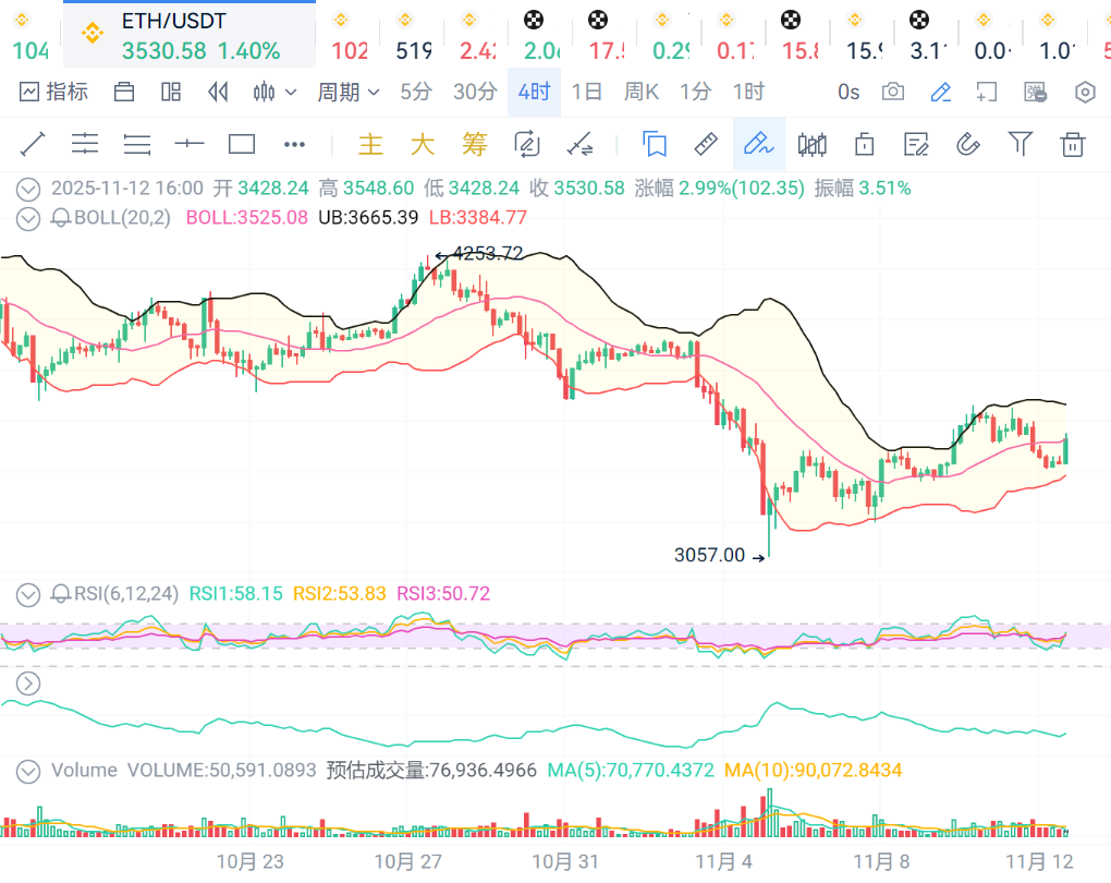 ETH: On the 4-hour chart, the price continues to oscillate near the middle band of the Bollinger Bands, with a support level of 3,520 and a resistance level of 3,540.