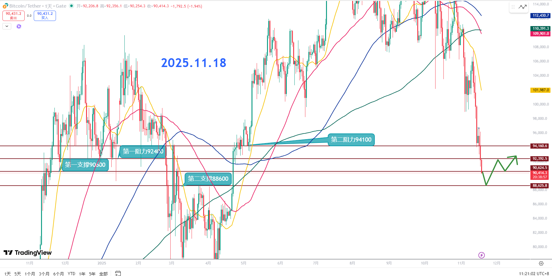 88.6K is a real support level; if it drops to this point, it can be considered that the worst short-term scenario is nearly over. The first resistance level is 92.4K, and the second resistance level is 94.1K.
