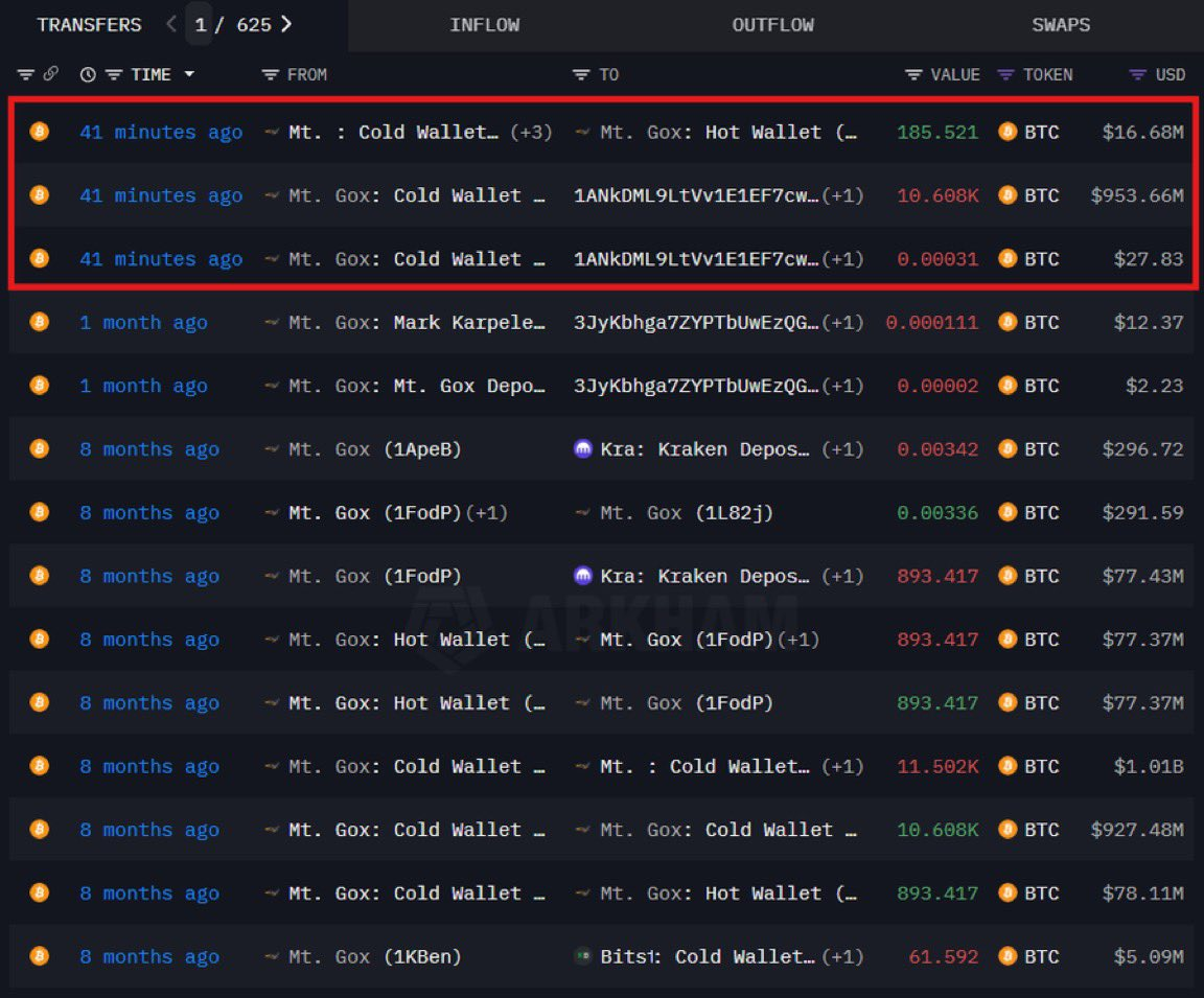 2. Small amount (185–186 BTC): Flowing back to Mt. Gox's own Hot Wallet, valued at approximately $16–17 million.