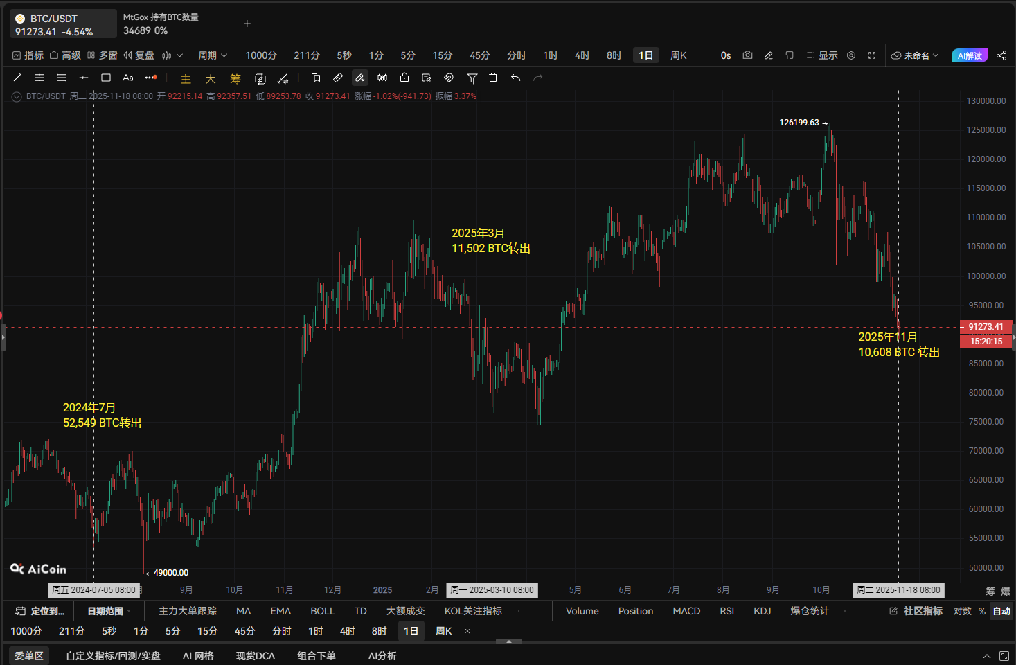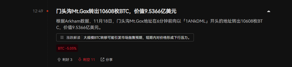 On November 18th at noon, the Mt. Gox cold wallet, which had been silent for 8 months, suddenly made a big move: it transferred out over 10,000 bitcoins (worth approximately $950 million) in one go.