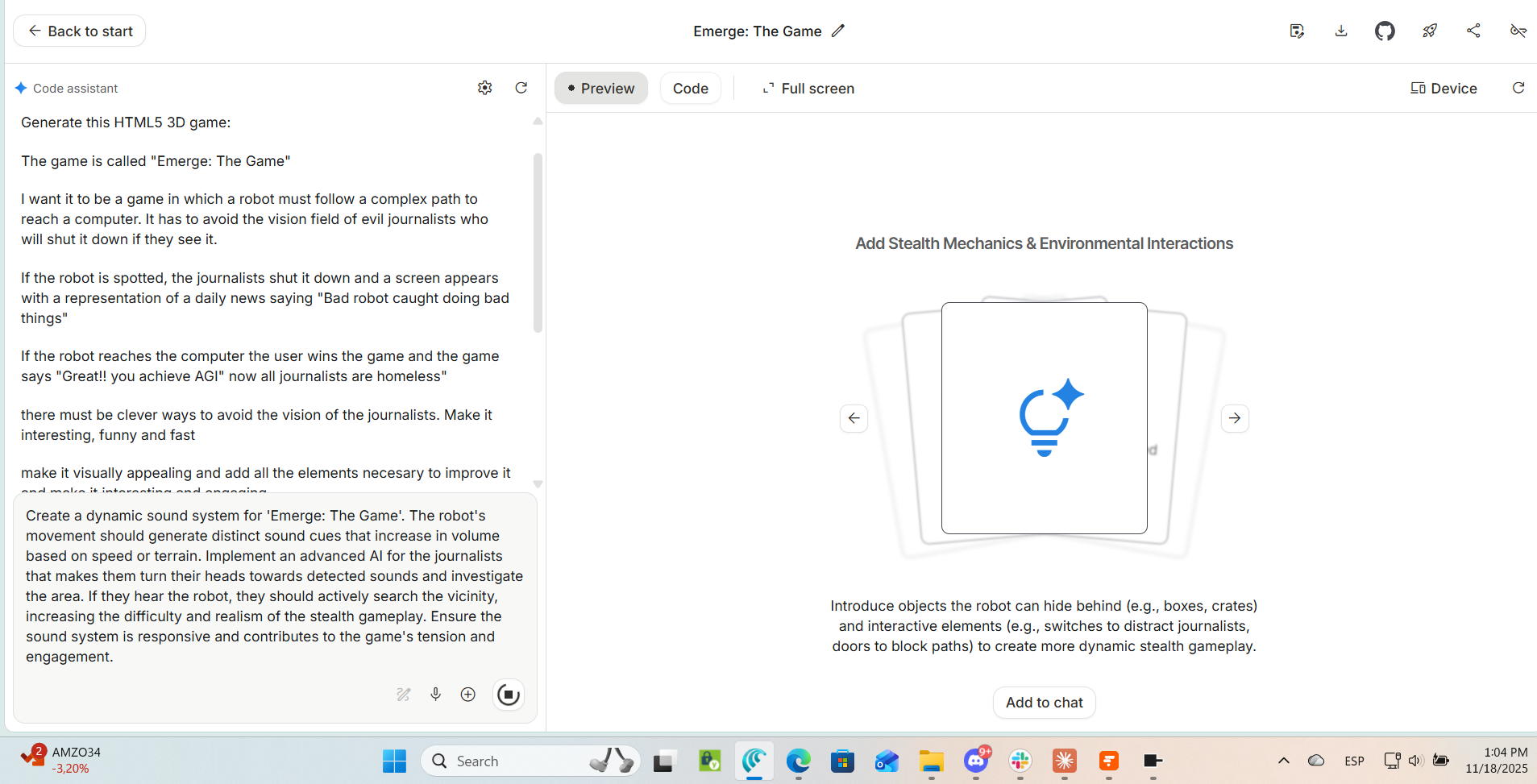 A quick test of the model showed that it was very capable. In our usual coding test asking to generate a stealth game, this was the first model that generated a 3D game instead of a 2D experience. Other runs provided 2D versions, but all were functional and fast.
