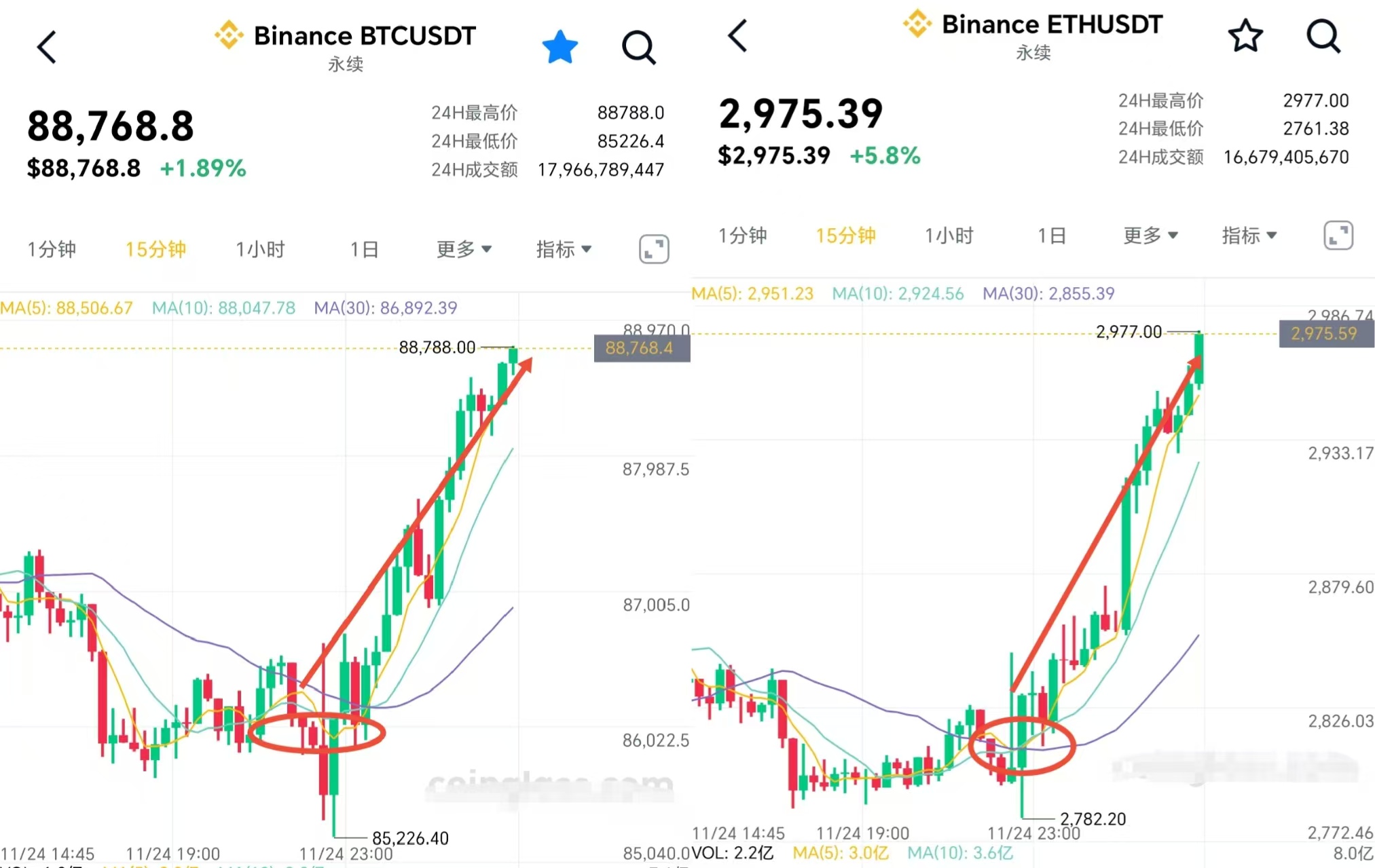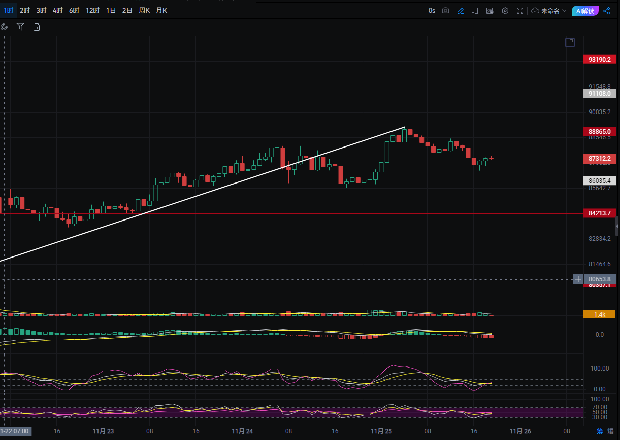 Let's briefly review. After Bitcoin closed with a doji candlestick last night, the one-hour KDJ and RSI both formed a golden cross. The one-hour bullish sequence was five in a row. As it reached 88200, the upward momentum slowed down, peaking around 89000. The MACD's upward momentum significantly weakened, and it faced continuous selling pressure. Starting from five o'clock, Bitcoin formed a one-hour sequence of five consecutive bearish candles, retracing to the middle band of the one-hour Bollinger Bands at 87500, and after a slight rebound, it retraced to around 86600, which is the solid closing price from noon on the 23rd, receiving buying support.