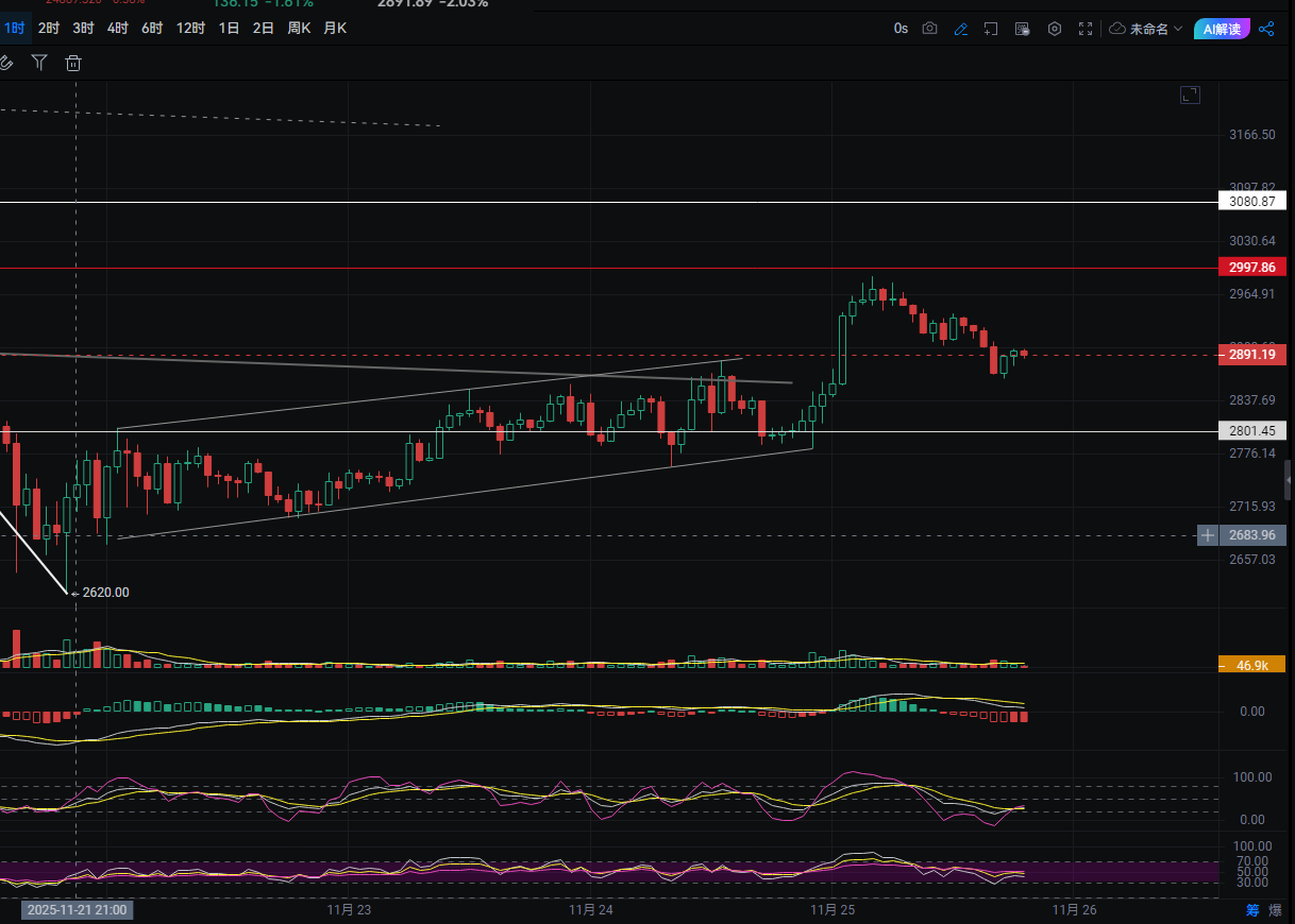 The movement of Ethereum during this period is relatively independent. Since the 22nd, it has been operating in an upward correction channel. During this process, it tested the highs, and there was buying support every time it retraced to 2800. The structure has been very stable. On the night of the 22nd, it reached the bottom of the 2780 channel, and then moved up by 200 points, peaking at 2990. This position is quite clever, as it can trigger liquidations for those who shorted with ten times leverage around 2700. The retracement also touched 2860, which was the pressure point from the morning of the 21st. We all know that important divergence points will be repeatedly effective, and we can view this as the starting point of a tug-of-war, or at least a contested area.