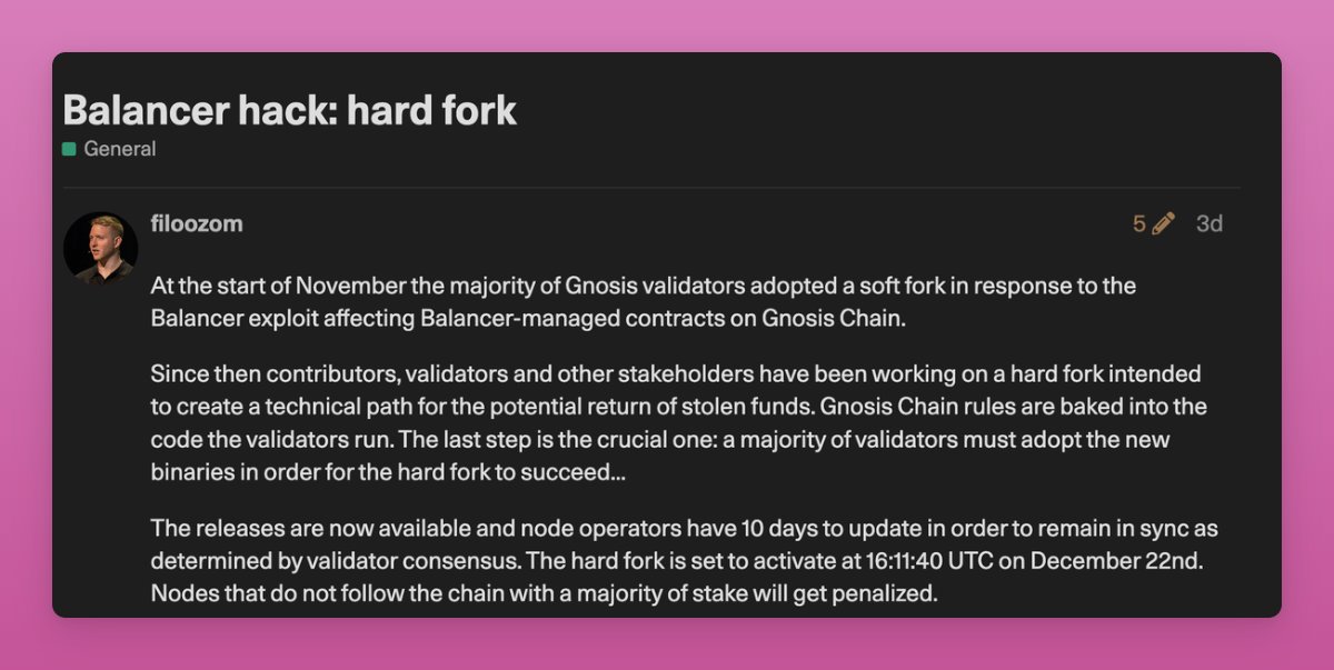 Gnosis is considering a hard fork to recover funds from the Balancer hack.