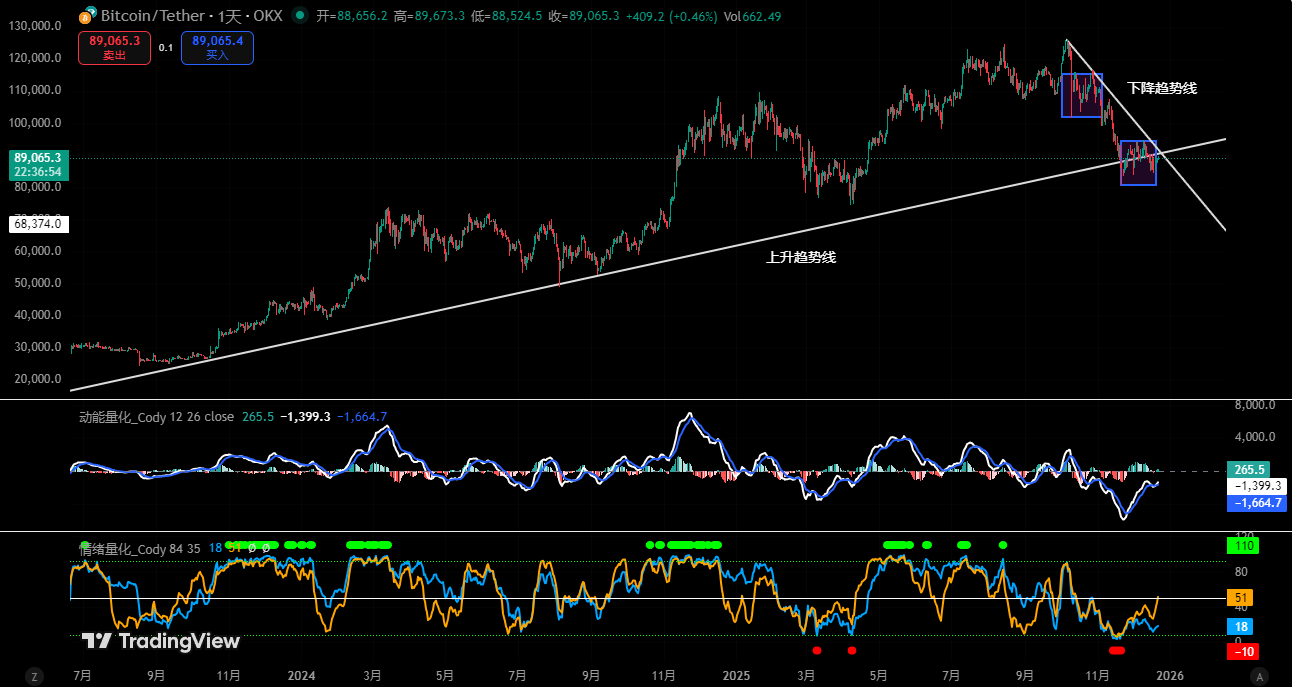 • From a macro technical perspective (see Figure 3 below): In the daily chart of Bitcoin, the rising trend line representing a long-term bull market (since the end of 2022) is about to intersect with the descending trend line defining recent adjustments (since the October 2025 high). The market is currently in a repair and oscillation period after breaking the long-term trend, with Bitcoin's price under dual pressure. Before the price can strongly break through this dual pressure with volume, all upward movements can only be viewed as a rebound under a bearish pattern, with the effective breakthrough of these two key trend lines serving as the final basis for judging the market's mid-term directional choice.