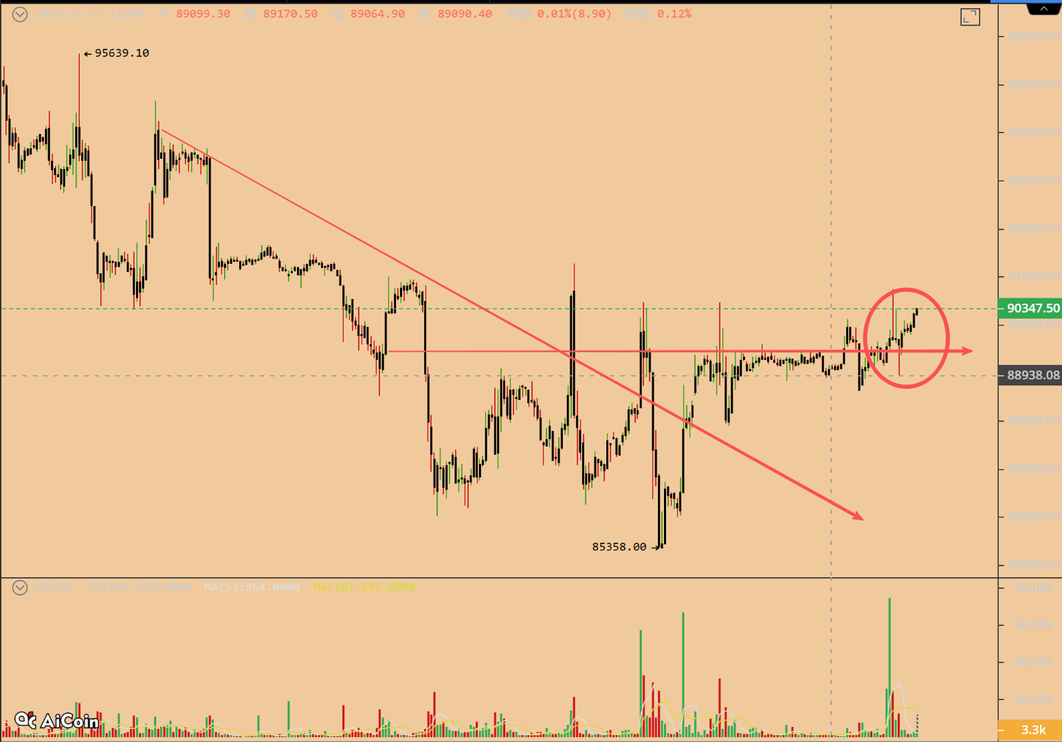 Bitcoin has been hovering between 90,000 and 84,000 for a week. The market indicates that an upward rebound is about to begin, with a complete standard structure, weakening downward momentum, and the downward trend line has been broken. This round only looks at the 1-hour cycle for a rebound, not a large cycle reversal. The large cycle bear market remains unchanged, with the rebound price target around 104,000.