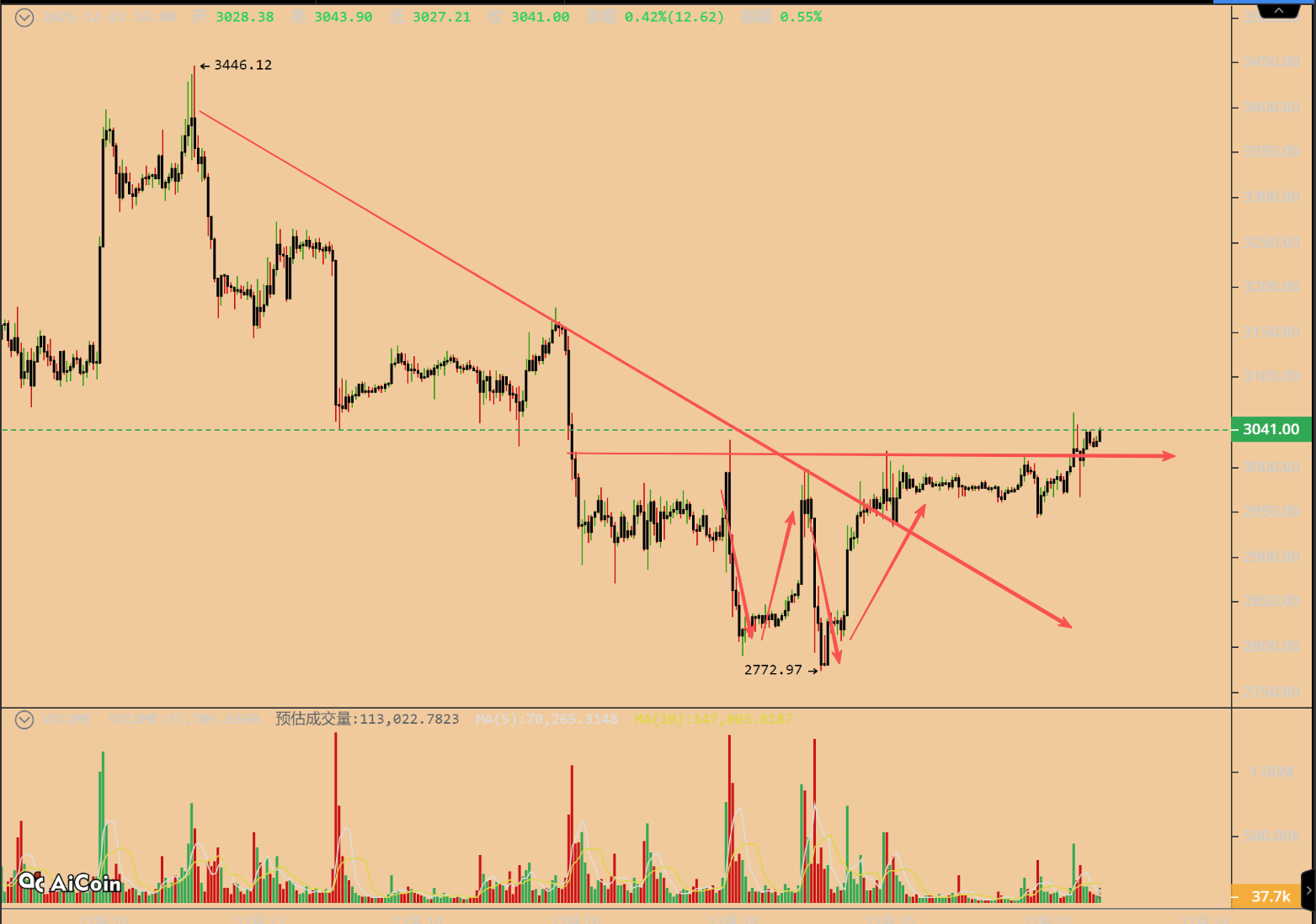 The Ethereum market is even more evident, with a bottom structure that is relatively more standard than Bitcoin. The market could start at any time today. Similarly, Ethereum is also looking for a rebound, with a target price of around 3,600. Market analysis suggestions are for reference only; actual market decisions change rapidly. Grasp the market direction and establish an investment belief system. Follow the public account: