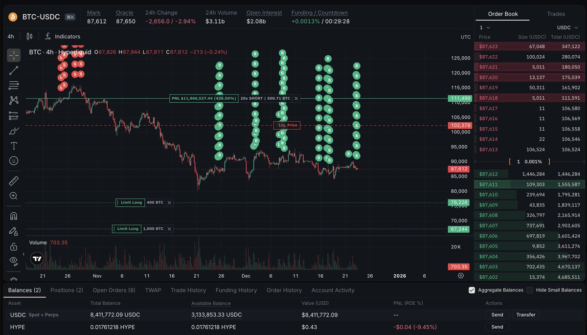 Swing Trader 0x5d2 is up $12.5M in realized and unrealized PnL on a BTC short that he has been holding for 2 months now, since shorting $63.6M of BTC at the end of October.