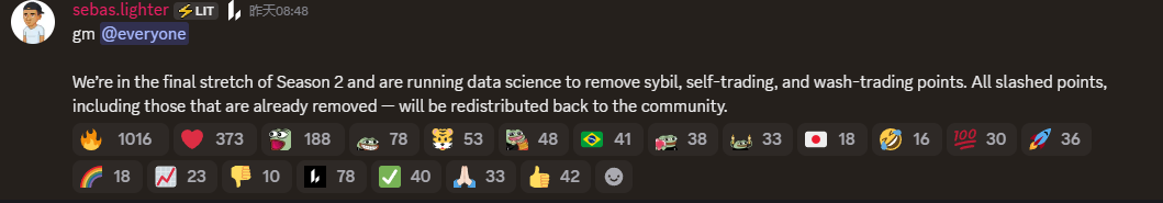 For early users interacting with Lighter, do not "pop the champagne halfway"; points cannot be considered profits until they are converted into actual LIT tokens. According to the latest announcement released by Lighter on its official Discord, "We have entered the final stage of the second season of the points activity, and we are currently conducting data analysis to remove witch addresses, self-transactions, and points obtained through wash trading. All points that are reduced (including those that have already been removed) will be redistributed to the community."