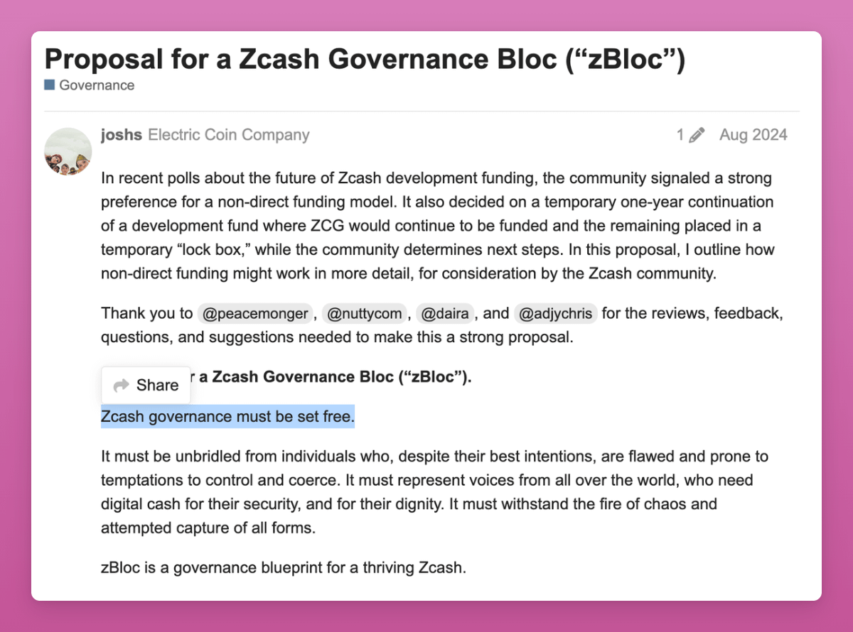 In Aug 2024, Josh Swihart proposed "zBloc" model to unlock the funds for builders.