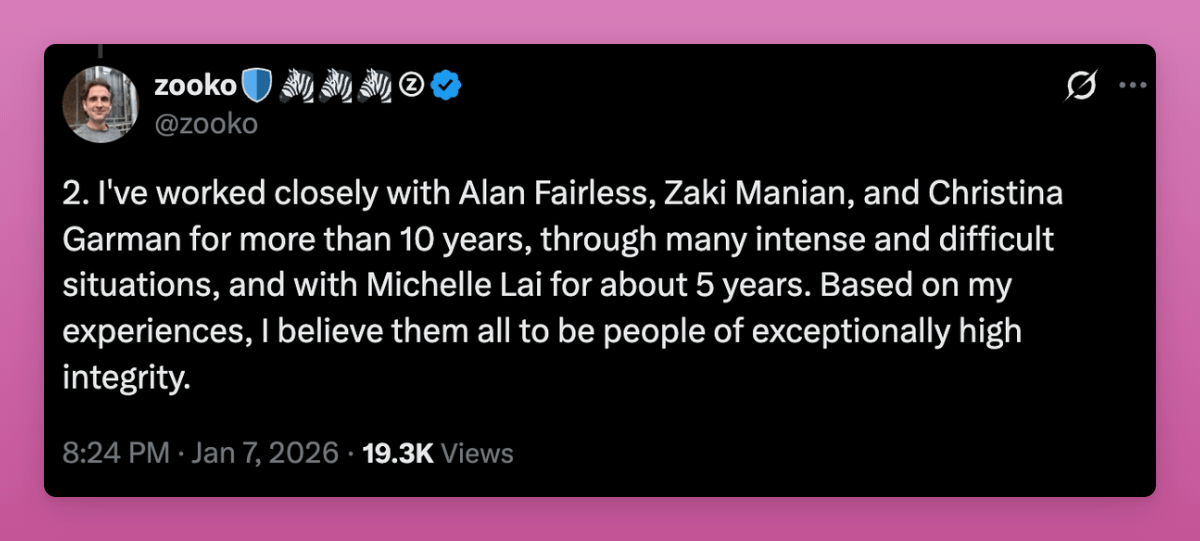 Zooko also wrote in support of the Bootstrap Board's 'exceptionally high integrity' after the resignation post thus the situation is indeed complex.