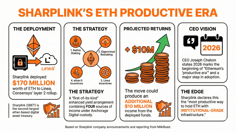 Sharplink has deployed $170 million worth of ETH on Linea, aiming to diversify its yield sources through an enhanced yield arrangement.