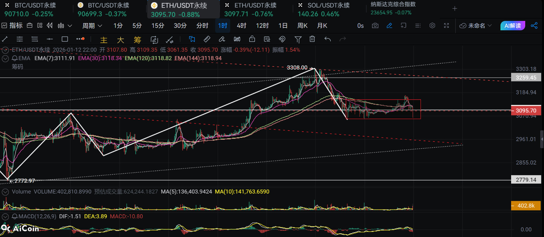 The trend of Ethereum has been consolidating around 3100 since the 9th, oscillating five times between the lower 3050 and upper 3150. There has been no buying support around 3100, indicating that short-term enthusiasts are using 3100 as a base for their trades. The long-term divergence is also present here. At eight o'clock today, the one-hour EMA7, EMA30, and EMA120 all converged at 3120, and after being broken, the selling pressure was amplified. Currently, the four-hour EMA120 and EMA144 are around 3080, and we need to see if the buying support in the 3050-3080 range is strong, as this will directly determine the market direction. During our analysis, Ethereum dipped to around 3065, and we have already taken a long position.