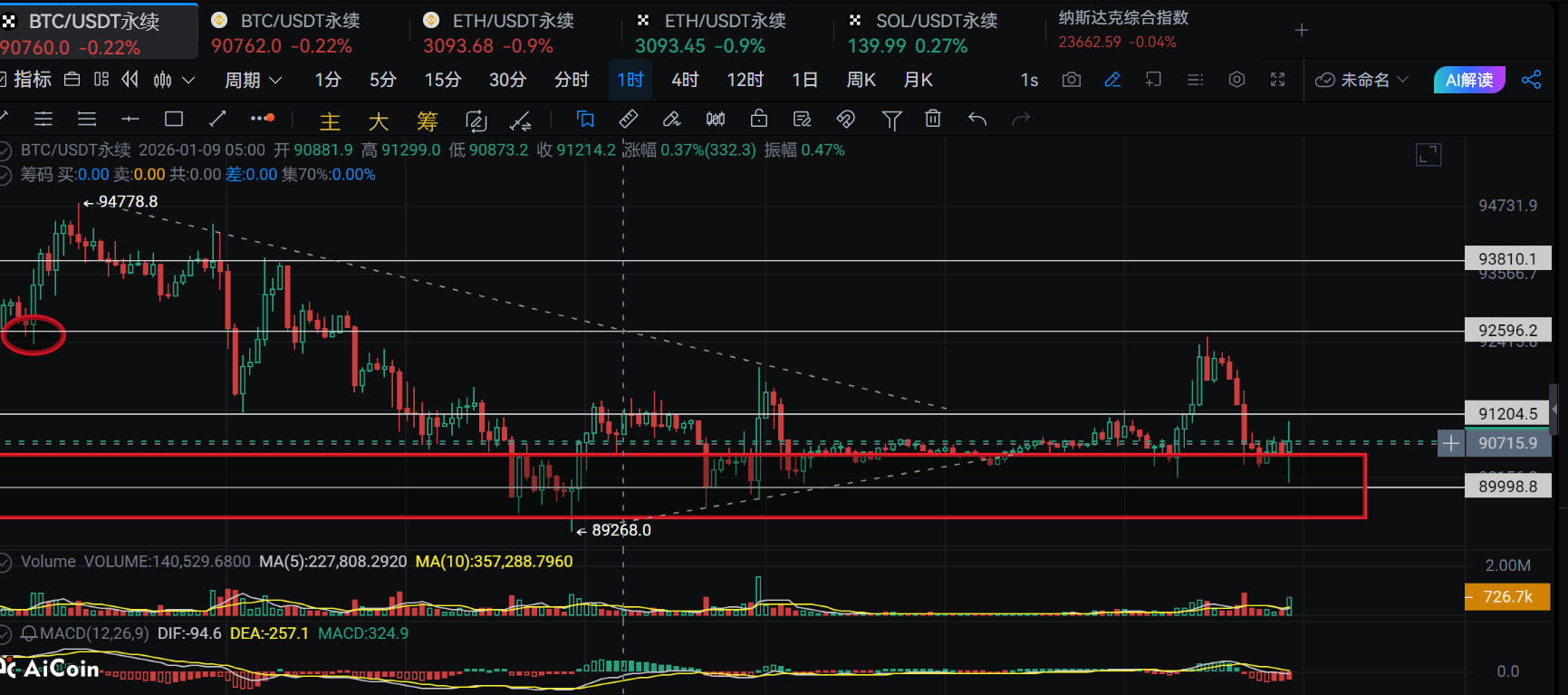 Let's briefly review the recent market situation. There isn't much value in the review. Last Friday, the market rallied, retraced, and consolidated for two days. In the early hours of today, after reaching 91200, it dropped to around 90200 at seven in the morning, then received buying support, and the market reached our previously set expectation of 92500. Consequently, this wave caused the buying positions that entered below 89500 before the 9th to miss out twice. If you have been paying attention to Xin Ya, you should recall that on the 9th, I mentioned that the long positions were being liquidated and the short positions were being taken for profit, and that we should look for a rebound entry in the 89500-90500 range. It seems to align with expectations.
