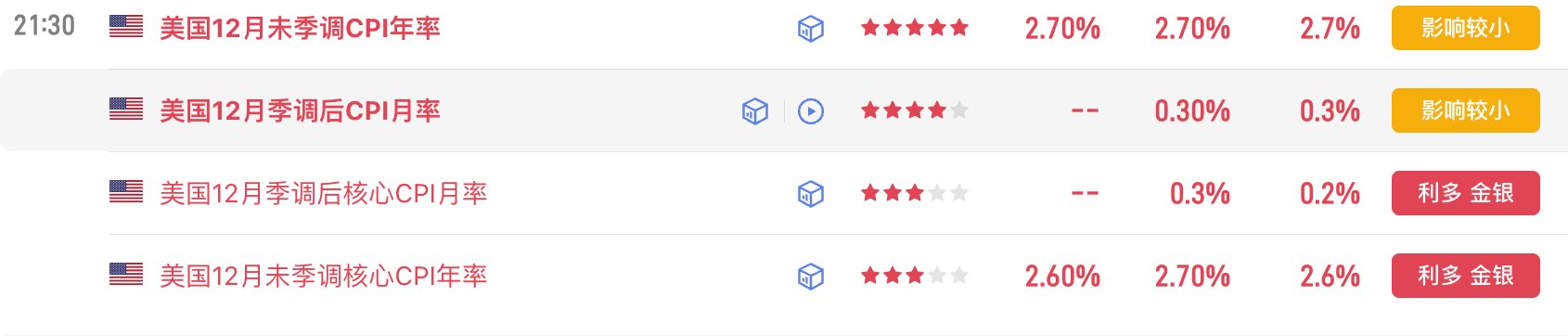 Last night's CPI data was neutral to slightly positive. U.S. stock index futures saw a short-term rise, with the December CPI year-on-year and month-on-month rates basically meeting expectations at 2.7% and 0.3%, respectively. The core CPI year-on-year and month-on-month rates were both 0.1% lower than expected, at 2.6% and 0.2%.
