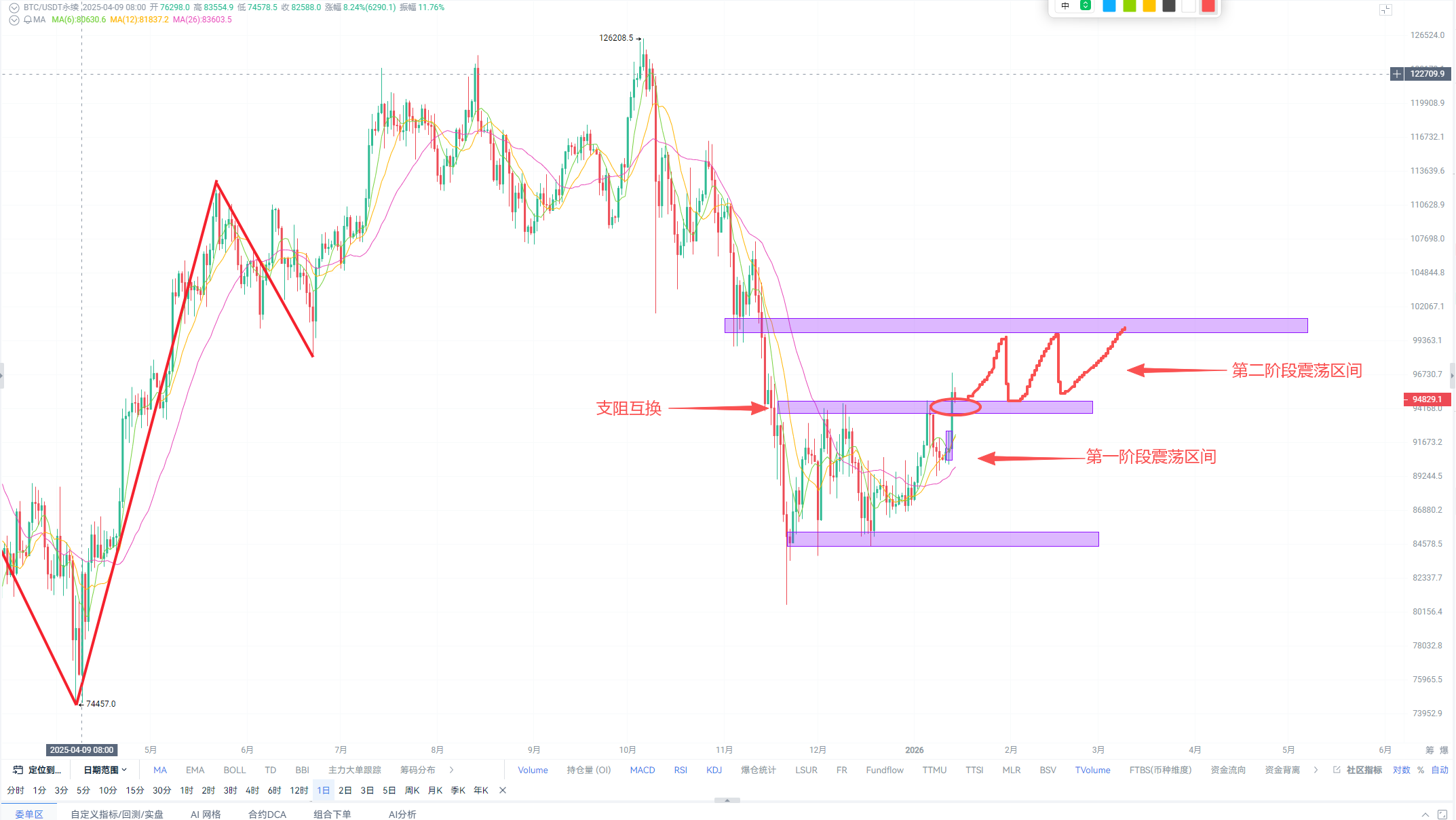Previously, Lin Chao mentioned that the cryptocurrency market in January is likely to rise (see the previous article "January Market Repeats, Welcoming the 2026 Bull Market"), but this does not mean that the bearish phase will end immediately. The entire cryptocurrency market will continue to experience wide fluctuations. Taking BTC's movement as an example, after breaking through the first range of $95,000, it completed a support-resistance swap, retracing to $94,000 to $95,000 as support and continuing to expand into the second fluctuation range (see the chart below). It will not suddenly enter a bull market as everyone hopes. Lin Chao estimates that this upward consolidation will continue until the end of the first quarter of 2026. The key point lies in the results of Trump's visit to China.