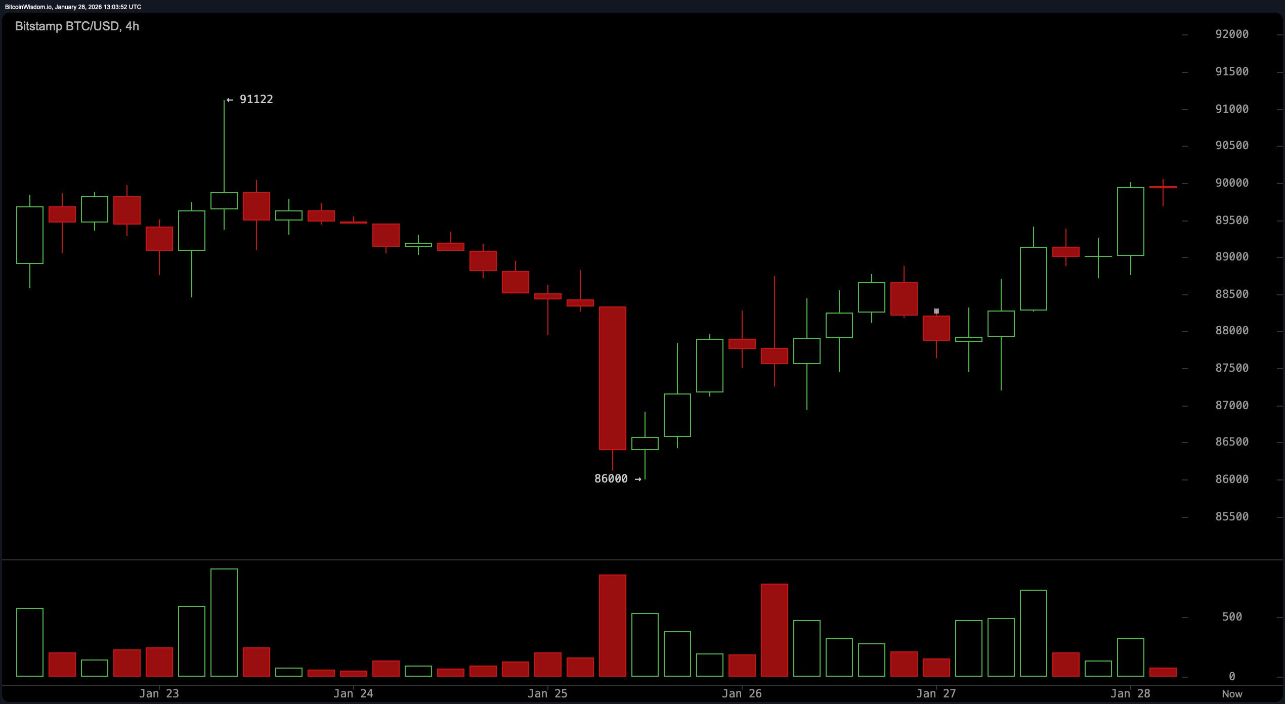 Zooming in on the 4-hour chart, bitcoin seems to be catching its breath after its recent sprint. The pattern since the January 25 low at $86,000 resembles a rounded bottom—a classic shape for staged recovery. Prices have since crept up in a stair-step fashion, but the resistance around $90,000 to $91,000 is acting like a velvet rope outside an exclusive club: it’s letting some through, but not without hesitation. A modest build-up in momentum is visible, but it’s conspicuously lacking the kind of volume one might expect for a breakout encore. A cautious approach may be warranted as the structure tests the overhead barrier.