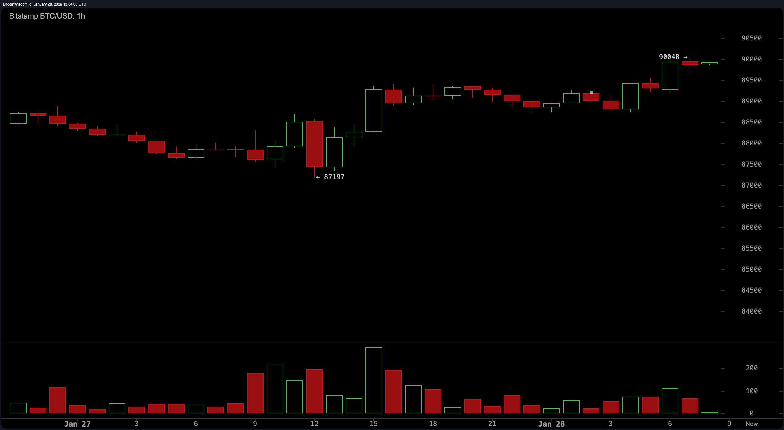 On the 1-hour chart, bitcoin’s behavior turns flirtatiously bullish. After bottoming at $87,197, the price has not only printed higher lows and highs but also formed a tight consolidation just under the recent high of $90,048. While momentum seems intact, the shrinking volume suggests a pause might be imminent—either a mild correction or just bitcoin catching its breath. Dip-buyers are eyeing the $88,700 to $89,000 range, provided it comes with a reversal candle as garnish. Short-term targets are clustered just above $90,000, although a strong breakout could send those ceiling tiles flying.