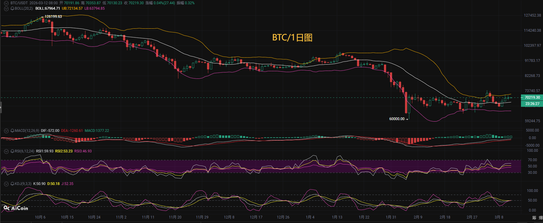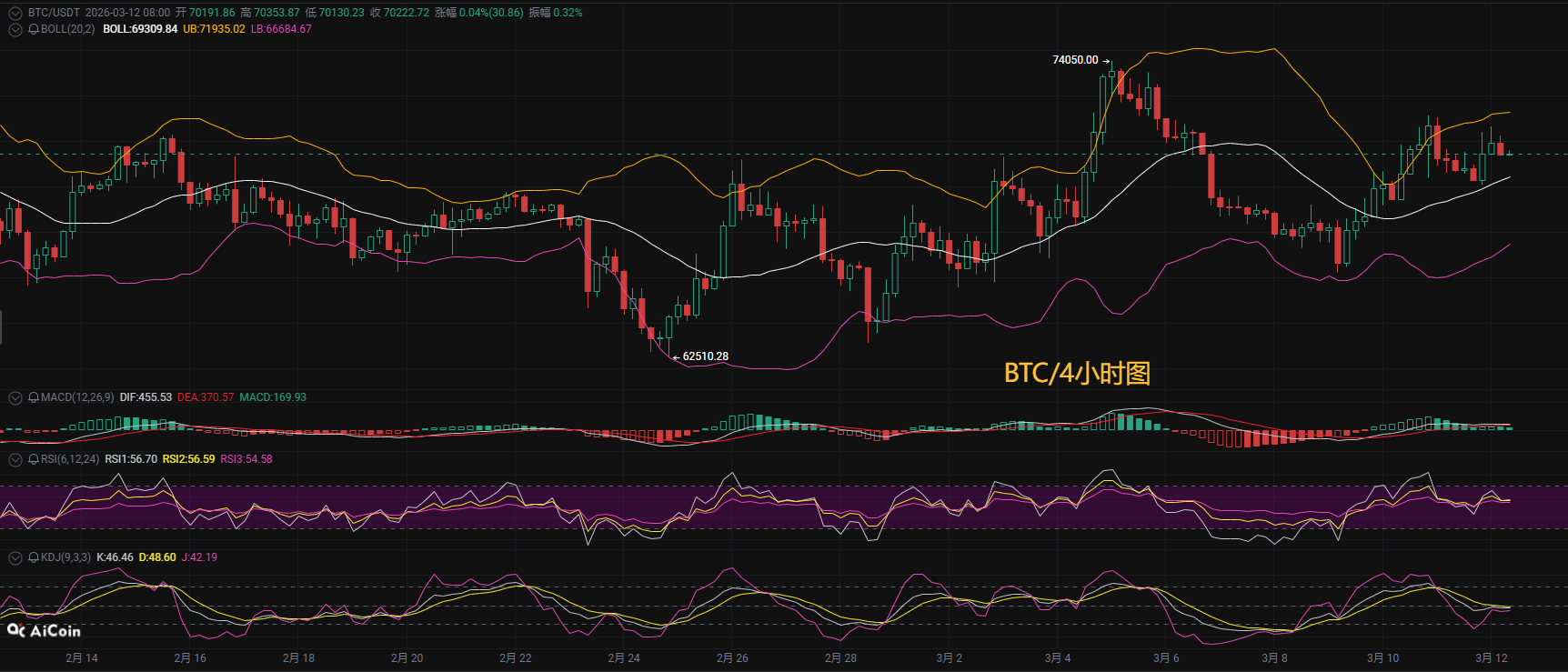 Looking at the short-term hourly chart, the Bollinger Bands are narrowing, and after a long upper shadow identified at 71320 USD, the price pulled back, showing clear selling pressure above 71500 USD. The daily chart has displayed three consecutive bullish candles, but the gains have diminished, suggesting a weakening of short-term upward momentum. Currently, the hourly chart has formed a consolidation range between 69500 and 71150 USD, with a death cross signal appearing in the 4-hour MACD indicator (DIF crossing below DEA). The price continues to receive support at the 4-hour EMA7 (70079 USD), and the downward pressure is not strong, while the lower support has not been breached, with the 30-day moving average (69333 USD) providing short-term dynamic support. Watch for resistance at 71700 above and support in the 68500-69000 area below. Cautious investors can wait for a break to follow the trend, ensuring timely profit-taking.