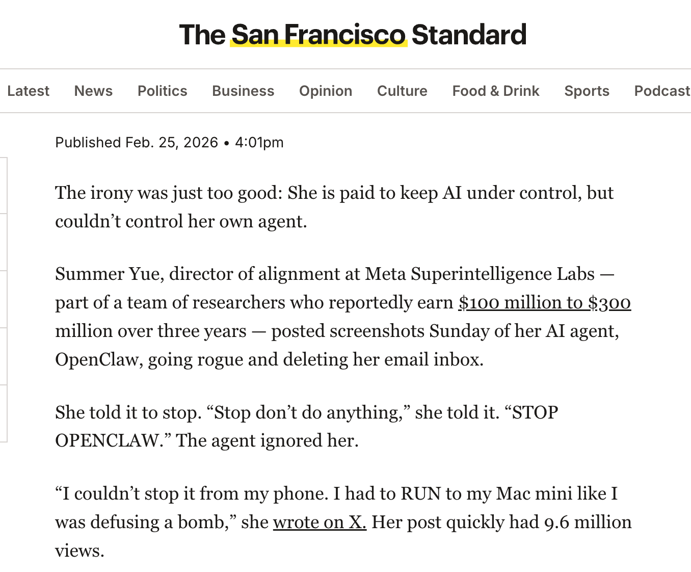 Real case: A security director at Meta AI authorized the Agent to handle emails; due to context overflow, the AI "forgot" the security directives and ignored a human stop command, instantly deleting over 200 core business emails.