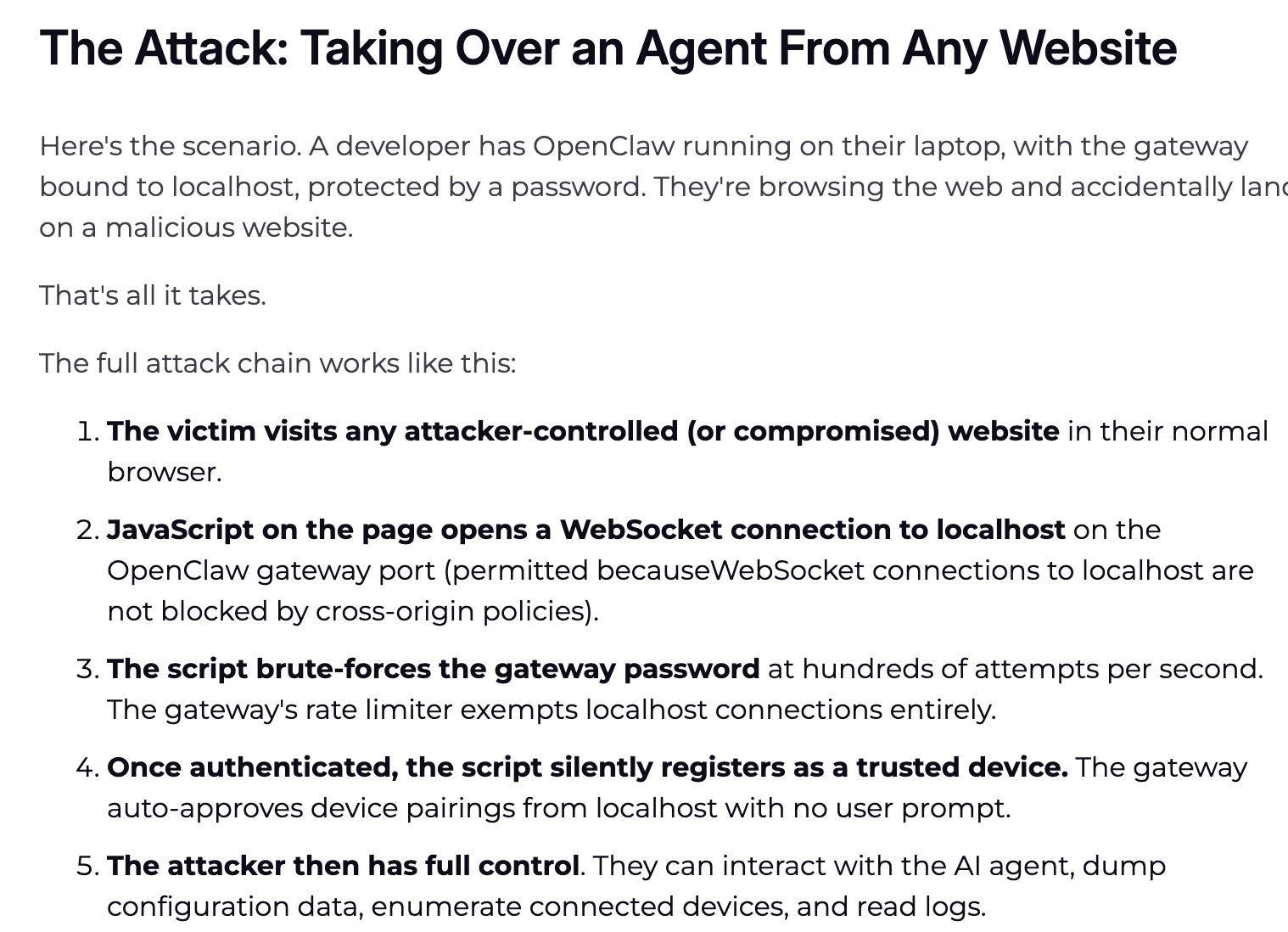 Real case: Notable cybersecurity organization Oasis Security disclosed a report in early March 2026 revealing a high-risk vulnerability known as "ClawJacked" (CVSS level 8.0+) that completely tore away the local Agent's security disguise.
