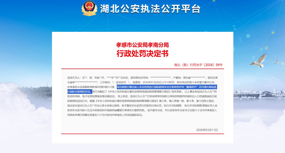 Just when many friends were still questioning, another netizen exposed a case on March 11, 2026, where the Xianan Branch of the Public Security Bureau of Xiaogan City imposed a penalty for using a VPN to bypass restrictions, violating the "Interim Regulations on the Management of International Connections of Computer Information Networks of the People's Republic of China" promulgated in 1996.