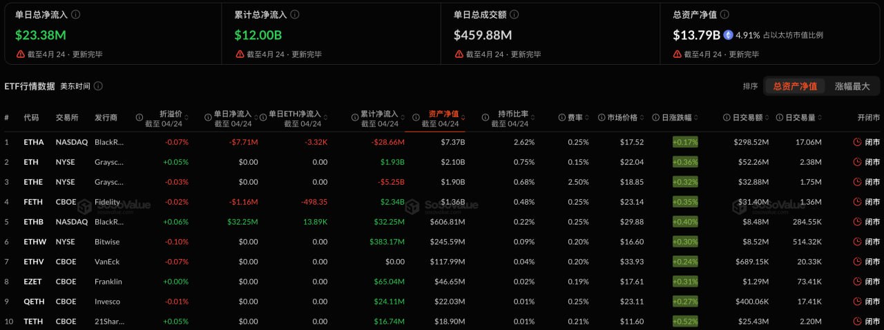 PANews April 25 news, according to SoSoValue data, yesterday (Eastern Time April 24) the total net inflow of Ethereum spot ETFs was 23.3807 million dollars.