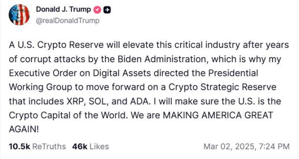3 月 6 日,特朗普通过行政令分别建立了「战略比特币储备」和「美国数字资产储备」。比特币储备只包含比特币,而数字资产储备则包括多种山寨币。行政令发布前,特朗普曾表示储备中将包含 XRP、Solana 和 Cardano。
