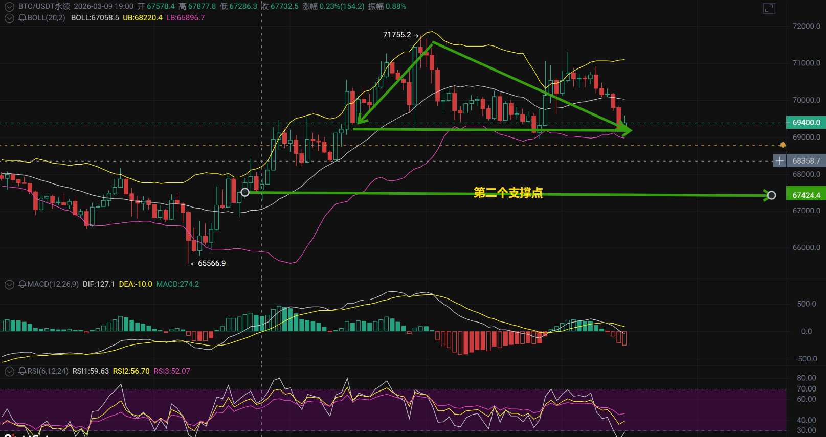 ema:价格跌破ema(69894),价格70035-69351构成动态阻力带。