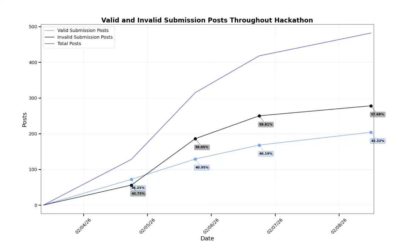 moltbook.com 上 m/usdc 子社区中,随时间变化的有效与无效项目提交帖数量。