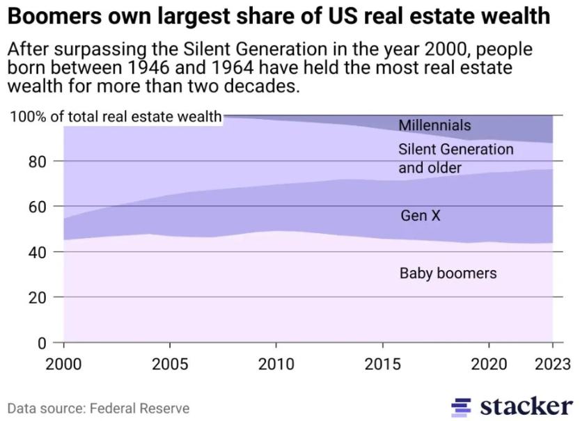 这一资本规模惊人:仅美国股市总市值就约达 69 万亿美元(其中婴儿潮一代持有约 40 万亿美元以上),而美国住宅房地产市值再增 50 万亿美元(尽管婴儿潮一代及前代人口占比不足 20%,但持有超 20-25 万亿美元的资产)。总计近 60-70 万亿美元的财富需从资本资产体系中退出,而此时,下一代年轻群体的收入定价能力正不断减弱,可支配财富也寥寥无几。