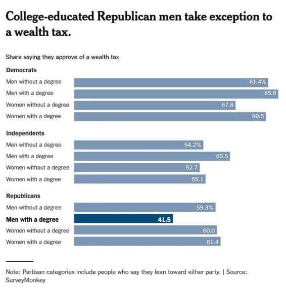 看看资本主义的发源地与最后堡垒 —— 美国。《纽约时报》关于公众对财富税态度的民调显示,除大学学历男性(这一群体人口正快速萎缩)外,所有人口群体对财富税的支持率几乎一致。