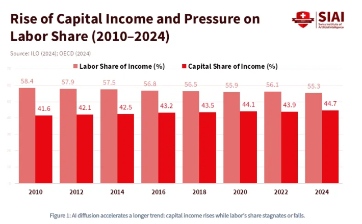 自 1980 年以来,劳动收入占美国 GDP 的比例已从约 65% 降至 55% 以下,而这还是在大型语言模型(LLM)普及之前。高盛在 2023 年估算,生成式人工智能可能使 3 亿全职岗位面临自动化风险。