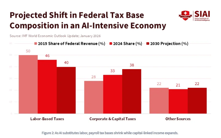 换言之,人工智能不仅是资本密集型技术,更是破坏劳动的技术。人工智能的崛起将永久改变社会运行的底层经济原理,重塑资本与劳动之间无法逆转的关系。更具体地说,当劳动力成本与计算成本趋同时,全球将爆发一场新的「资本战争」,需要政府前所未有的补贴、激进的产业政策与财政政策。在这个世界里,资本将成为主宰:资产所有权将成为尊严与永久底层阶级之间的唯一屏障。这也正是国际货币基金组织预测的:在人工智能主导的经济中,联邦税基将从劳动收入,转向企业所得税和资本利得税。