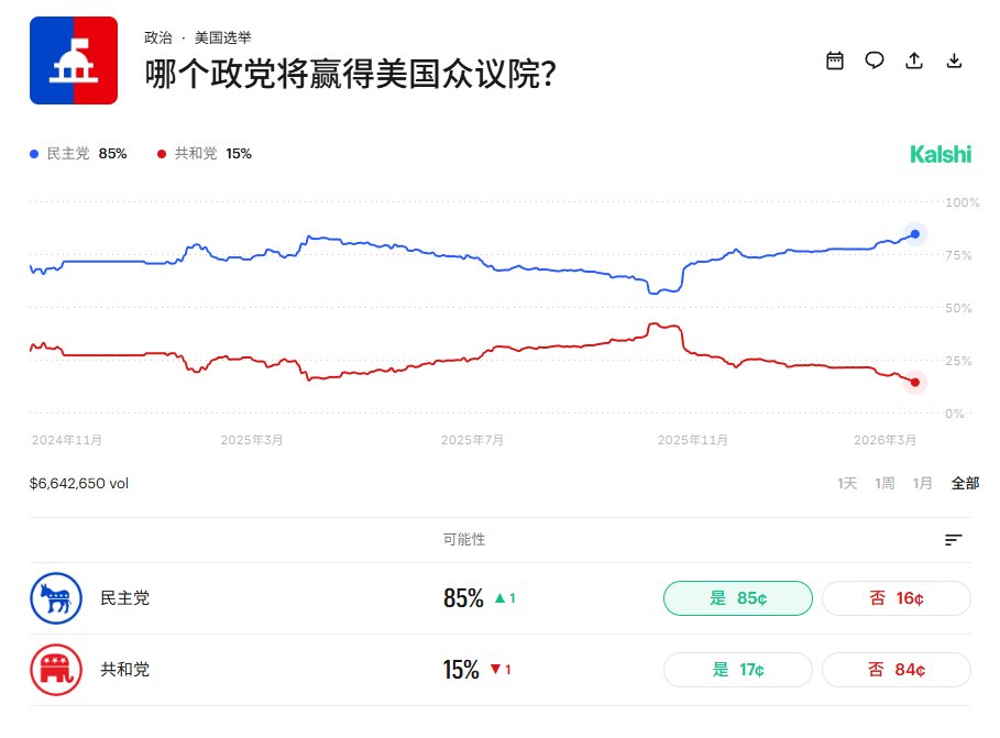 而归结是川普的原因主要是因为美国民众认为是川普亲自下令对伊朗发动军事打击,直接引发了这场伊朗冲突,导致全球石油供应中断。这还不算完,在最新的 Kalshi 对于中期大选的预测中,民主党赢得众议院的概率上升到了 85% ,这本身也是一种对总统的不信任体现。