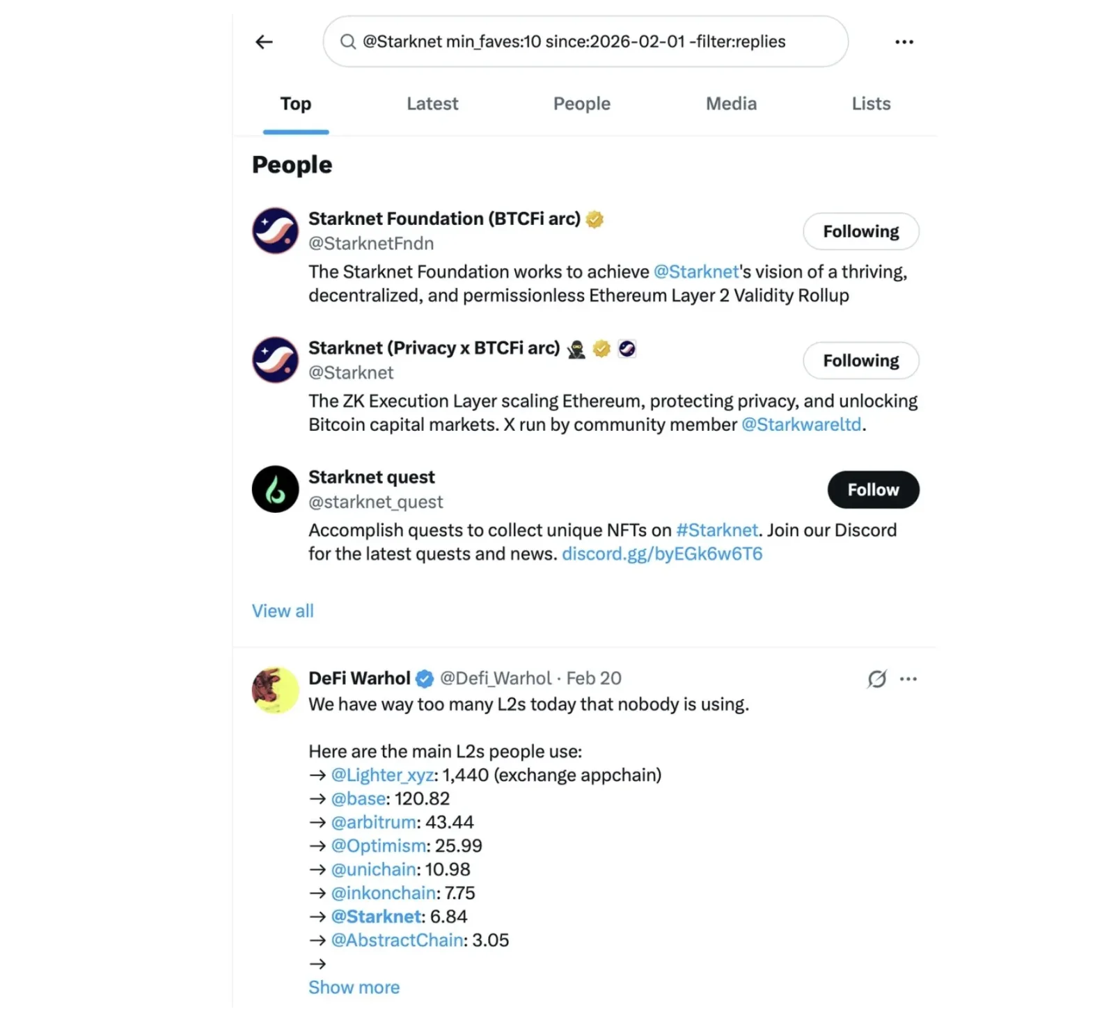 如果你在 X 上用简单的筛选条件,查看二月份提及 Starknet 的热门帖子,结果就显而易见了。