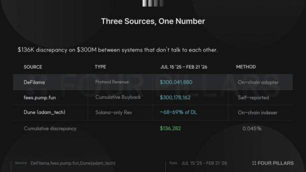 DeFiLlama 记录的 2025 年 7 月 15 日至 2026 年 2 月 21 日协议收入总计 300041880 美元。同期 fees.pump.fun 累计回购金额为 300178162 美元。两者匹配度达 100.05%,两个独立系统间 3 亿美元总量仅差 13.6 万美元。