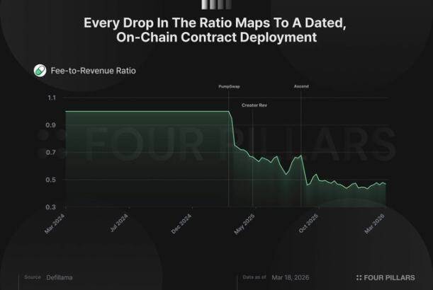 首先检验费用与收入比率,这是最难伪造的指标。Pump.fun 从每次联合曲线交易中收取费用,但并非全部计入协议收入,部分流向 LP、创作者及推荐奖励。数据集中,总费用与净收入比率从 1.0 降至约 0.48,但非渐进式下降,而是分三个阶段骤降,每一阶段均对应有链上记录的产品变更: