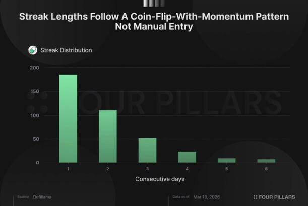 最长连续上涨或下跌为 6 天,平均连续长度 1.92 天,符合具有适度动量的自然过程预期。连续长度分布呈几何级数递减:185 次单日连续、111 次两日连续、52 次三日连续,直至 7 次六日连续。