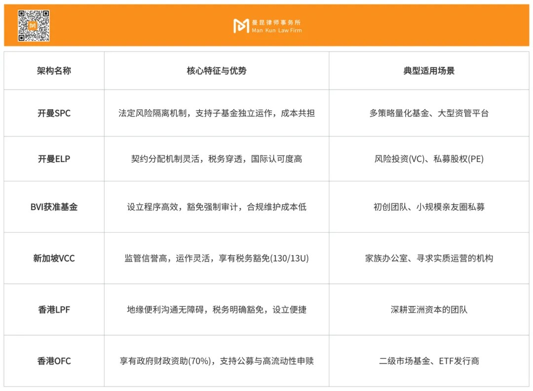 综合上述分析,六种主流基金架构的法律特征与适用场景总结如下: