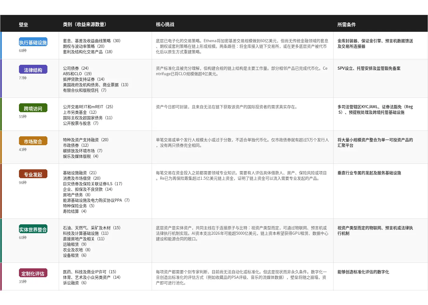 链上已有部署的34种收益来源集中于熟悉的领域:国债、私人信贷、公司债券。其余绝大多数尚未达到有意义的规模。七类不同的壁垒横亘在前。