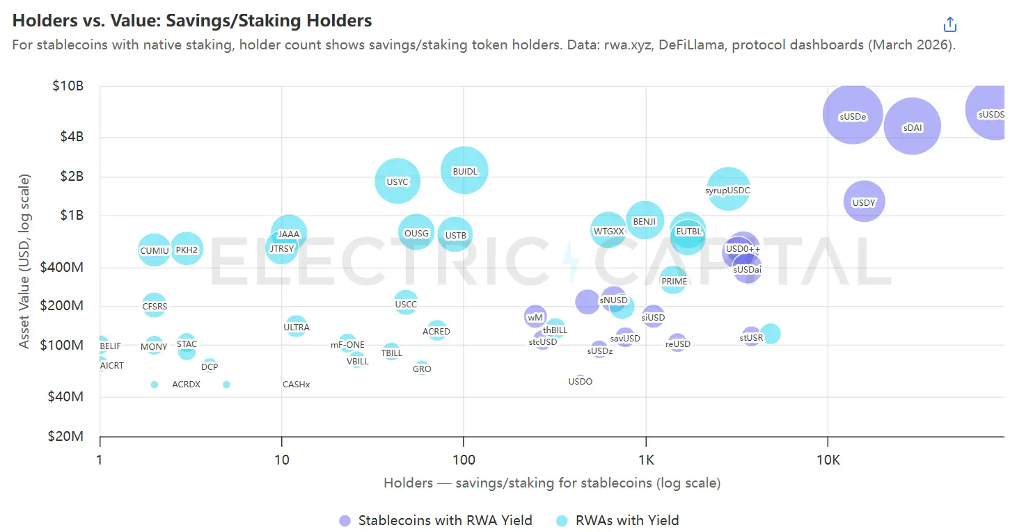 大多数收益型资产集中在图表左侧:35个市值超过5000万美元的非稳定币RWA中,有33个持有人数不足2000。这在很大程度上是结构性原因:BUIDL是一只仅限合格购买者参与、最低认购额为500万美元的基金,⁸ 约100名持有人本就是产品设计使然。但对于本可触达更广泛用户的产品而言,这一低数字折射出当前RWA对合作伙伴分发渠道的依赖。例外出现在右上角——是sUSDe、sDAI和sUSDS这样的质押稳定币,它们触达的持有人数量远超其他产品。