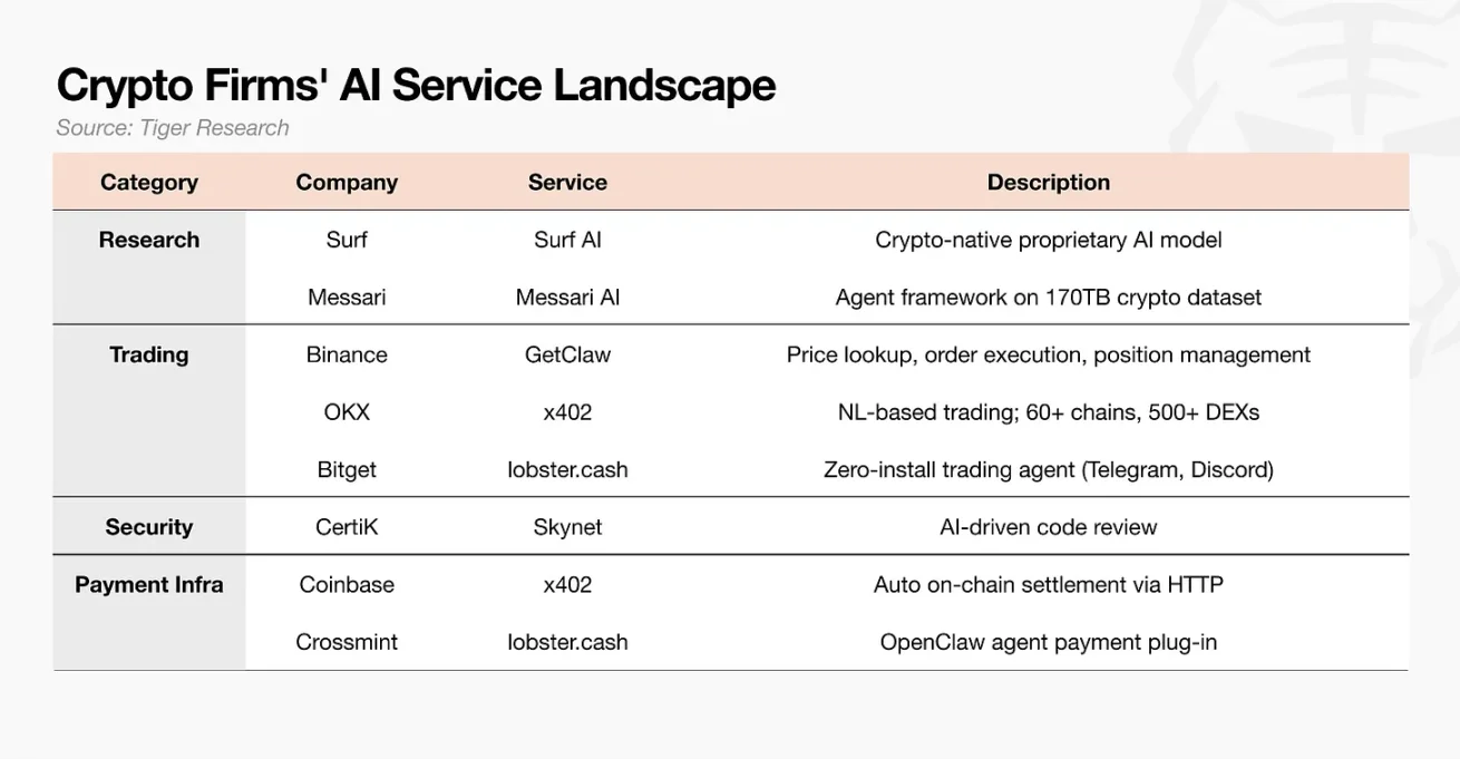 • 涵盖交易所、安全、支付、研究等领域的加密企业,正同步推出人工智能相关服务。