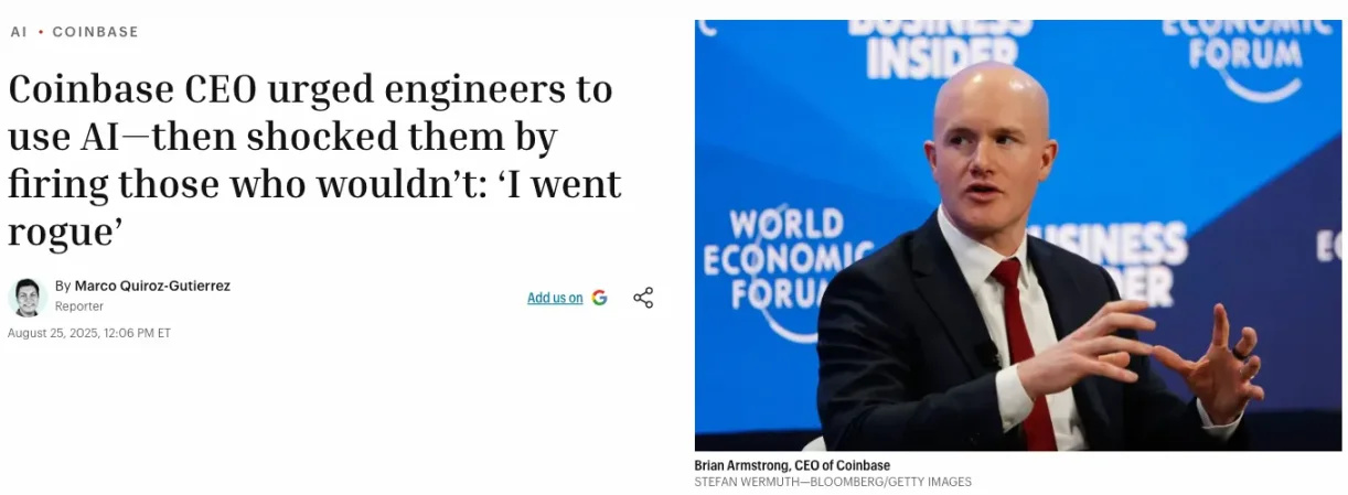这种紧迫感在 Coinbase 首席执行官 Brian Armstrong 的举措中可见一斑。他要求全体工程师在一周内完成人工智能编码工具的上手培训,并对未达标者予以解聘。