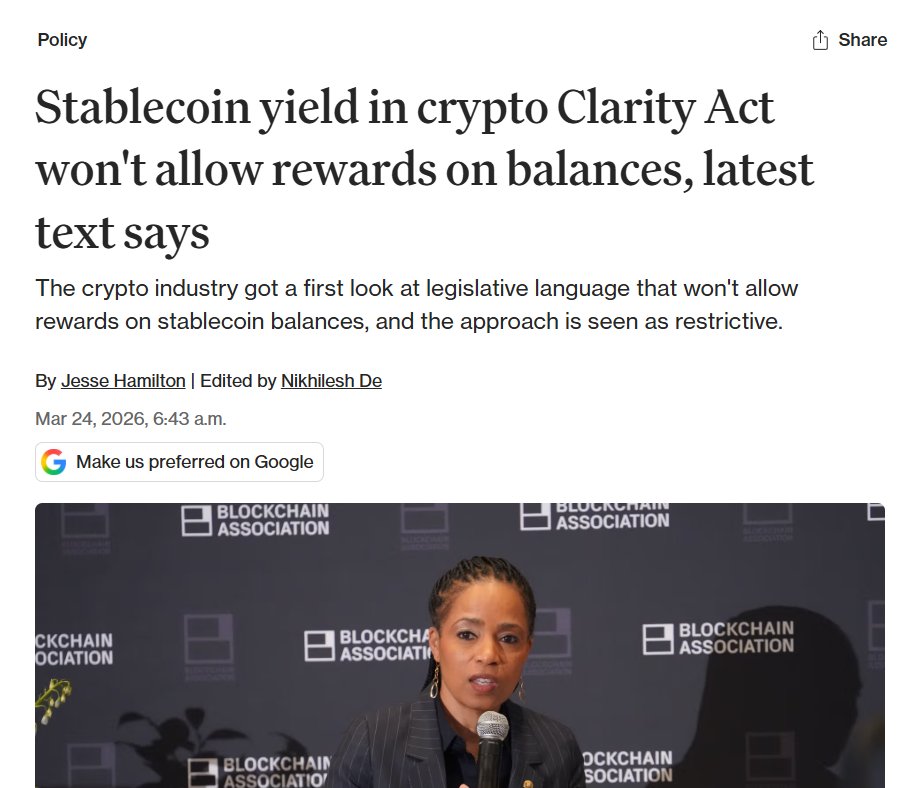 禁止稳定币像银行存款一样产生「余额型收益」,只允许基于用户的交易、交付行为产生「行为型奖励」。
