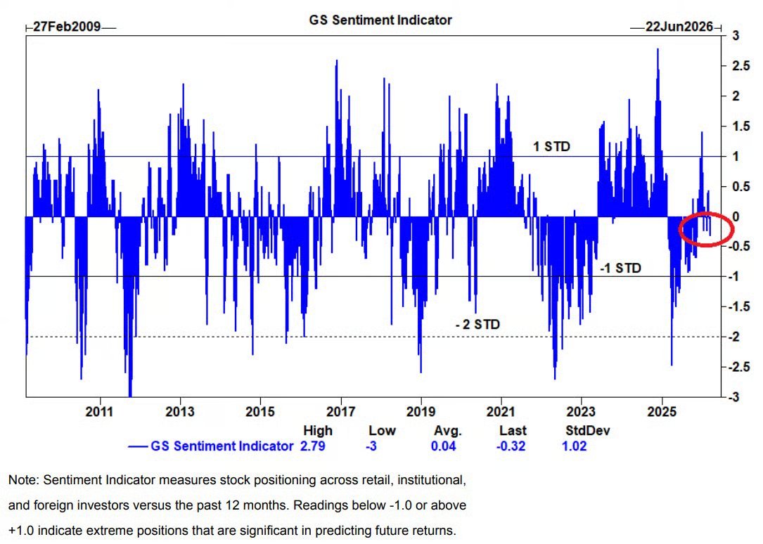 最新的 GS Sentiment Indicator 数据显示,当前美股投资者的仓位已经从前期偏热(净多头)回落到略偏谨慎(略微净空头)。