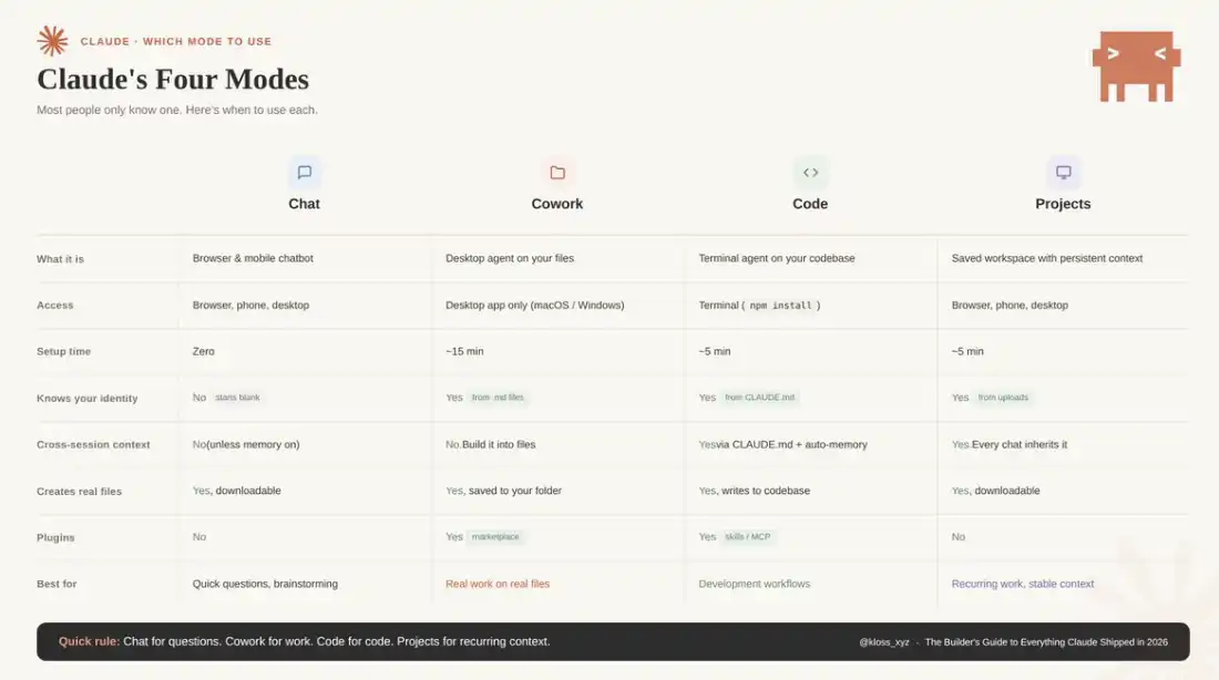 一个简单判断规则:Chat 快速提问,Cowork 让 AI 替你干活,Code 适合开发任务,Projects 稳定上下文的重复工作