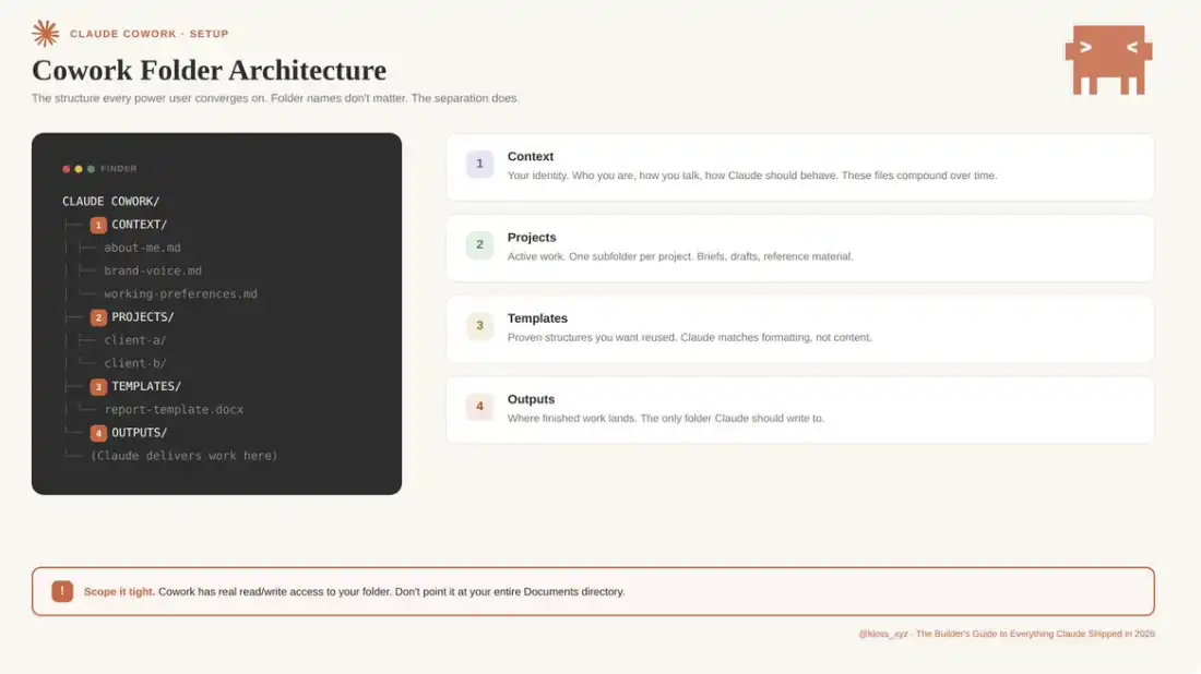 这样做既能保持结构清晰,也能限制 Claude 能访问的范围。几乎所有资深用户的实践最终都会收敛到类似的基础结构。文件夹叫什么并不重要,关键在于一定要做好分层与隔离。
