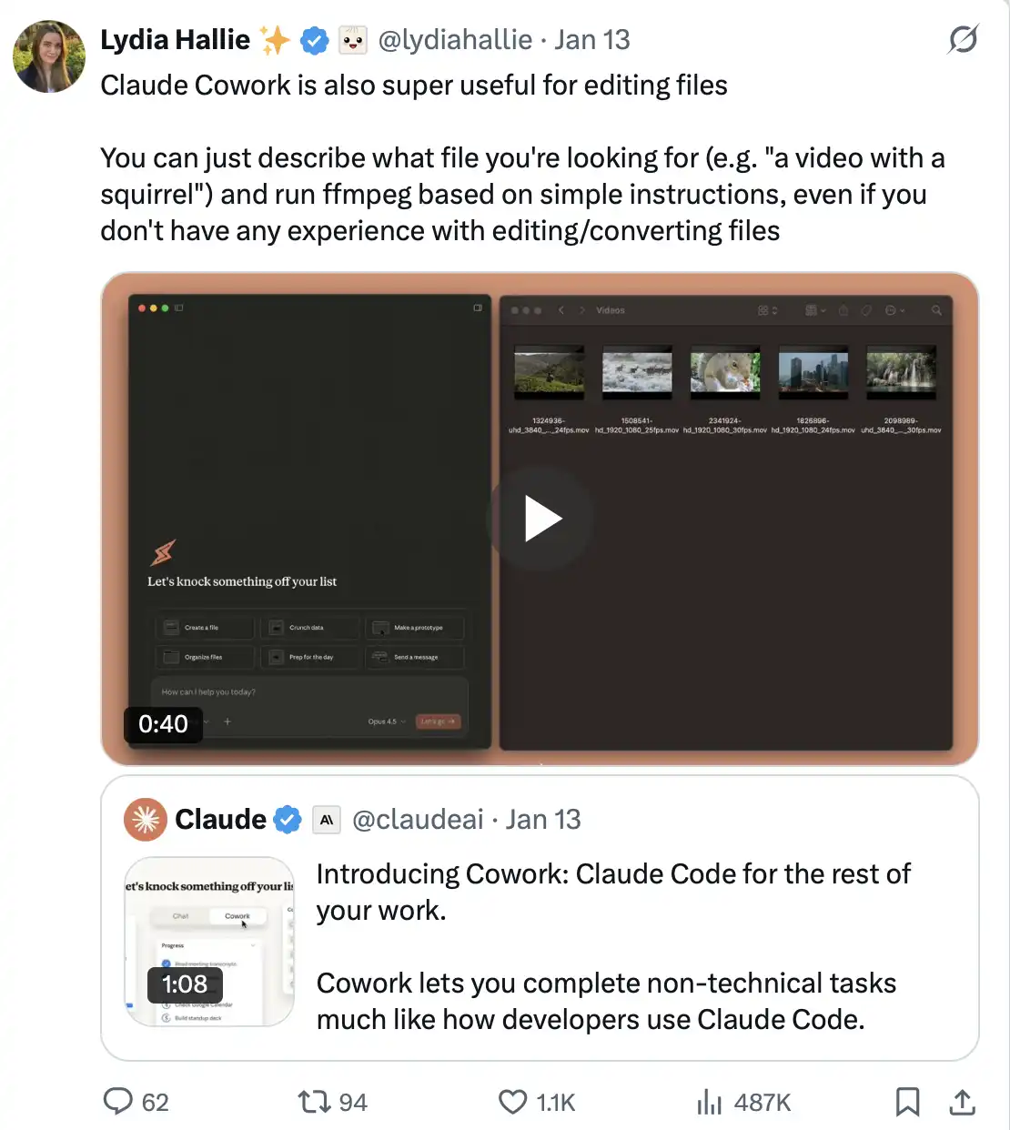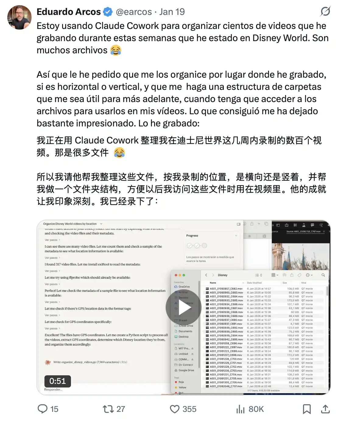 用户表示「Claude Cowork 在文件处理与编辑方面同样非常实用。你只需用自然语言描述要找的文件(例如「一个有松鼠的视频」),再给出简单的操作指令,Claude 就可以调用 ffmpeg 完成处理。即使你没有任何文件编辑或格式转换的经验,也能顺利完成相关操作。」