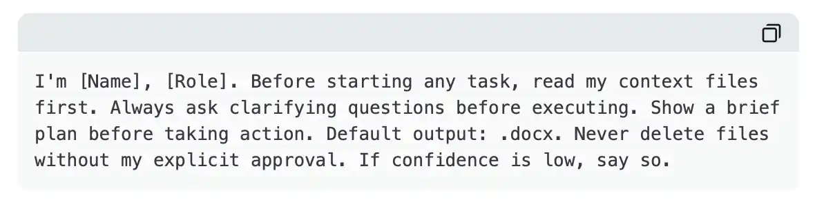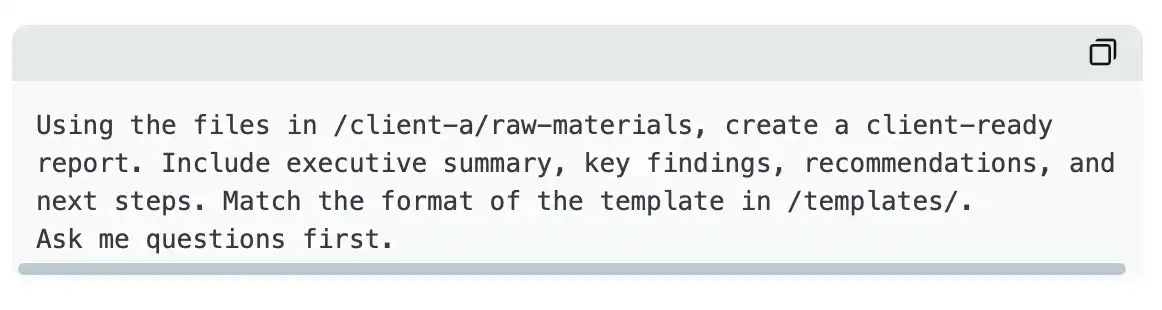 这意味着,即便是最随意、最仓促的提示词,也能产出经过校准的结果。Claude 始终知道你是谁,始终优先读取正确的文件,始终在做出判断前先进行确认。提示词本身,只需要负责当前的具体任务。